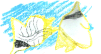 | 「おっ,チョウチョウウオだ。」 すぐそばに,黒と黄色のしましまが見えました。ぼくは,水中めがねをきつくかけ直し,「いち,にの,さん。」 息を思いっ切りすいこんで,一気に海中にもぐりました。さんごしょうの間の深い所まであおり足で近づき,水中カメラをかまえました。20cmぐらいのあざやかなチョウチョウウオは,まるで,海の中を大型のキアゲハがまうように,ゆうがに泳いでいました。水中カメラのピントを合わせるために足を止めると,自然に体がういてはなれてしまうので,カメラがゆれないてい度に細かいバタ足をしながらシャッターをおしました。カシャッ。(やったぁ。)ぼくは,海面にゆっくりとうかび上がりながらガッツポーズをとりました。 |